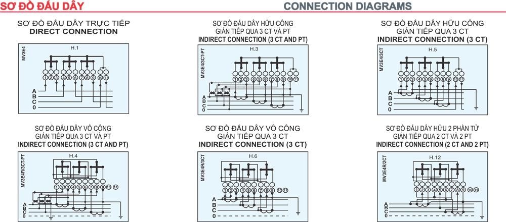 + 3 pha 4 dây: 57,8/100V; 63,5/110V; 120/208V; 127/220V;