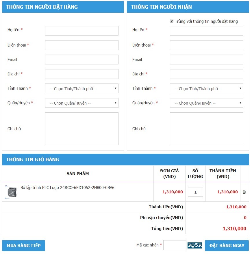 - Bước 3: Điền thông tin của bạn vào "Thông tin người đặt hàng". Nếu bạn đặt hàng cho người khác thì nhấn vào ô "Nhập thông tin người nhận hàng". Sau đó nhấn váo nút "Đặt hàng"
