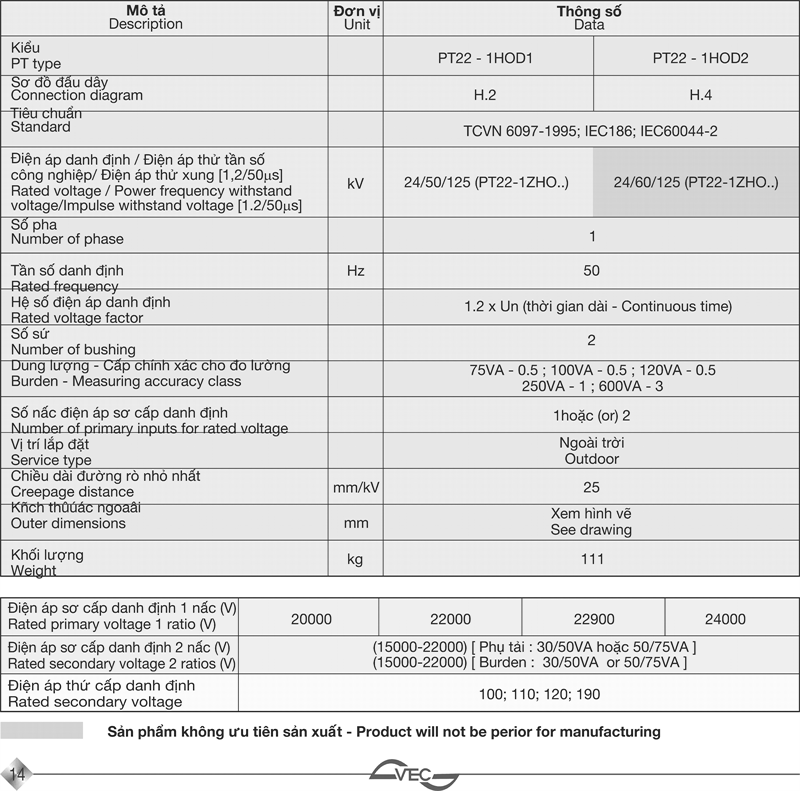 Máy biến áp đo lường trung thế 1 pha ngoài trời, kiểu ngâm dầu - Model PT22-1HOD